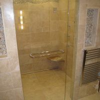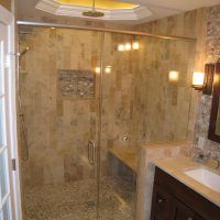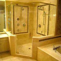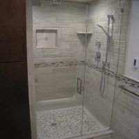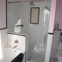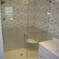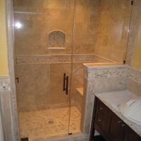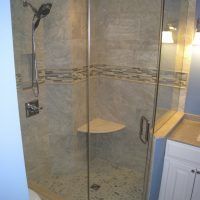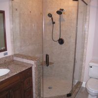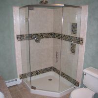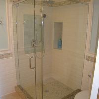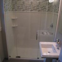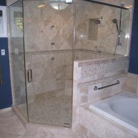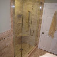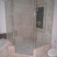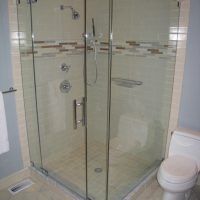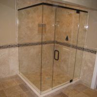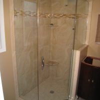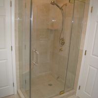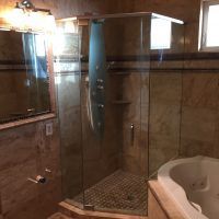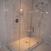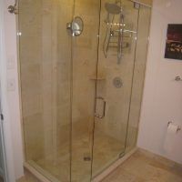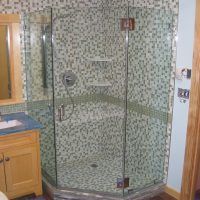 This type of shower enclosure is normally done in the corner of the bathroom. There is a fixed panel on the right and left sides at a 90º angle to the tile walls and also at a 90º angle to each other. The fixed panels are spaced apart from each other creating a door opening in the center at a 45º angle to the 2 fixed panels. The centered door can hinge from the right or left side depending on the layout of the bathroom. Frameless Neo-Angle showers are strongest when a top support header is used. The header helps to hold the Neo-Angle shape of the shower at the top and prevents the glass panels from flexing and hitting together at the top corners. There are some situations where a Neo-Angle shower can be done with out the top header support. It depends on where the door is attached. If the door is not in the center but hinged directly to the right or left wall it can be done with out a header.