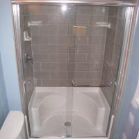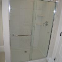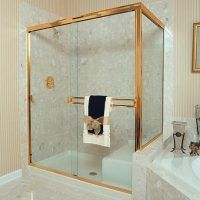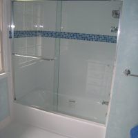 This type of door can be done as a “Framed By-Pass” (having an aluminum frame around each sliding door) or as a “Semi Frameless By-Pass” where the doors are made from 3/16” x 1/4”, or 3/8” tempered glass with polished edges hanging from roller brackets attached directly to the top of the glass. It is most commonly used on a tub or shower stall where there are three tile walls with the glass enclosure across the front side only. There is normally a perimeter frame consisting of a right and left wall jamb, a header track on top for the doors to slide on, and a sill piece on the bottom to act as a water dam. In most cases there are two doors that hang from roller brackets sliding on the inside of the top track. The doors slide back and forth past each other giving it the name “BY-Pass Doors”. If there are only two tile walls with a bottom “L” shaped curb for a shower or a tub with a finished front and one finished end, this type of shower can also be done as a 90º configuration with an additional fixed return panel enclosing one end of the enclosure. This allows for a more open feeling making the bathroom appear brighter and larger.