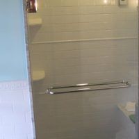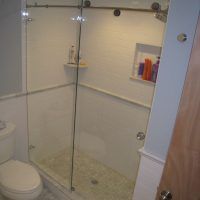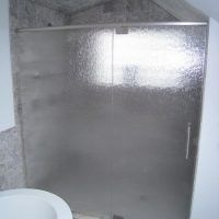 This type of enclosure is most commonly made using 3/8” tempered glass. There are some manufacturers that can make limited sizes using 1/2” tempered glass. This style of sliding shower door is classified as a frameless enclosure because it has no perimeter frame work. There is a thick heavy roller bar that extends from wall to wall. The roller bar is supported in the center by attaching the bar directly to the fixed glass. The fixed panel is attached at the bottom with thru-glass clips. Because the fixed panel is needed to help support the weight of the sliding door there can only be one door and not two. The door slides smoothly across the bar using large exposed rollers kind of an exposed barn door style of hardware.