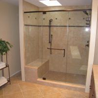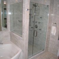 Frameless means just what it sounds like. This is a type of shower enclosure also referred to as heavy glass shower doors/enclosures because they are made from 3/8” or 1/2” thick tempered glass. There are many different ways to assemble a frameless shower enclosure. The most popular styles are assembled using clips, corner brackets, hinges, handles, and towel bars that are attached through the glass by fabricating holes, notches, and hinge cut-outs in the glass panels before the glass is tempered. There are other methods where instead of clips there are aluminum “U”-channels attached to the walls and curb that support the fixed panels. Still other methods of assembly require a support header around the top of the entire enclosure that ties together all of the fixed panels and supports the door. The main theme of a frameless shower is that the door itself is attached by heavy duty through glass hinges with no framework of any kind on the door itself.